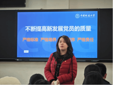 培训采用“理论讲解+实务指导”相结合的方式。蒋怀柳老师以“中国共产党党员发展流程与规范”为题,结合《中国共产党发展党员工作细则》与学校党员发展工作管理要求,系统阐述了发展党员工作的重要意义。她指出,发展党员是党的建设中的基础性、经常性工作,关系到党组织的生机与活力。质量是发展党员的生命线,必须全面贯彻“控制总量、优化结构、提高质量、发挥作用”的十六字方针,结合学科专业特点,严格程序、分层把关,确保每一位新发展党员政治合格、素质过硬。蒋老师围绕党员发展工作的组织流程,详细讲解了从申请入党、入党积极分子的确定和培养、发展对象的确定和考察,到预备党员的接收、教育考察及转正等关键环节的注意事项,系统梳理了“五阶段二十五步骤”的规范流程,并结合实际案例,深入解析了各阶段材料的撰写规范与常见问题。