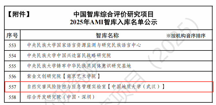 2025年7月25日,中国社会科学评价研究院正式公示“中国智库综合评价研究项目(2025)”AMI智库入库名单,我校自然灾害风险防控与应急管理实验室凭借在防灾减灾救灾领域的突出研究成果成功入选。